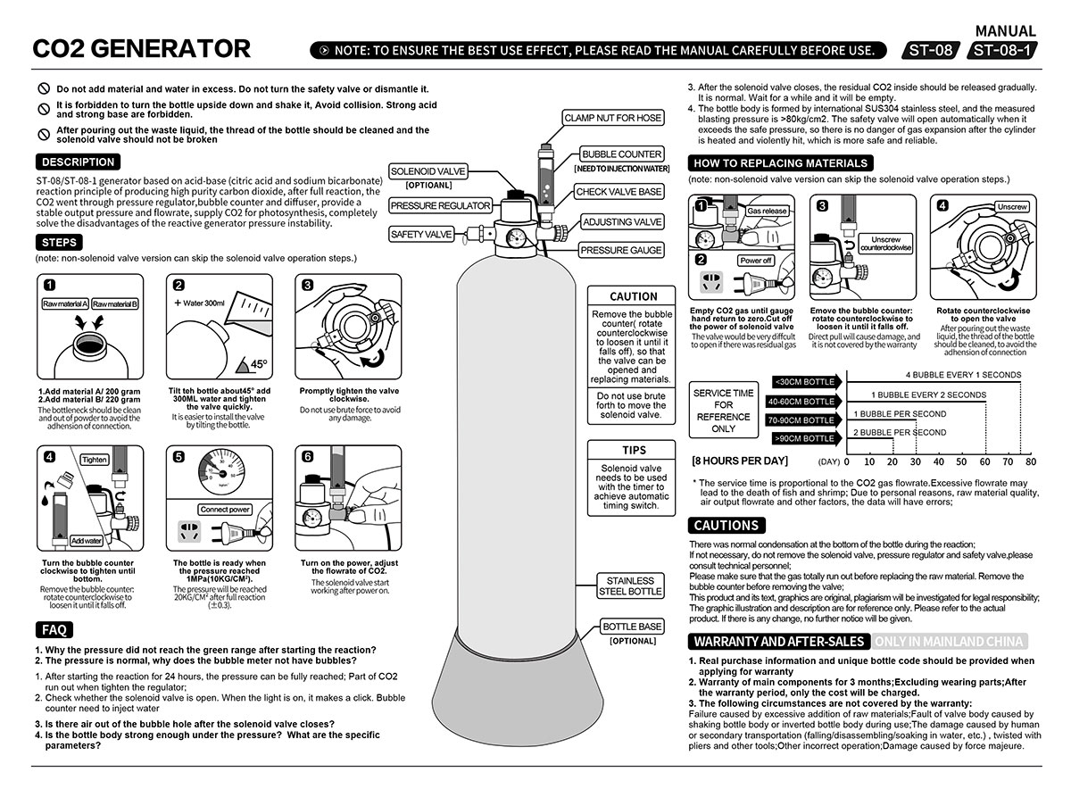 Úsáideann gineadóir CO2 aquarium ST-08-1 prionsabal imoibrithe aigéad-bun, ag imoibriú aigéad citreach le décharbónáit sóidiam chun CO2 ard-íonachta a tháirgeadh. Trí fhoirmle eolaíoch agus próiseas imoibrithe éifeachtach, scaoileann an gléas CO2 go seasta, ag soláthar soláthar leanúnach gáis do phlandaí aquarium, ag freastal ar a gcuid riachtanas fótaisintéise agus ag cur fás sláintiúil chun cinn. I gcomparáid le gineadóirí frithghníomhaíochta traidisiúnta, tá rialú brú feabhsaithe ag an ST-08-1. Feistithe le rialtóir brú tiomnaithe, cuntar mboilgeog, agus diffuser, seachadann sé brú aschuir cobhsaí agus scaipeadh mboilgeog aonfhoirmeach, rud a chuireann deireadh leis an míchaoithiúlacht de bharr luaineachtaí brú.